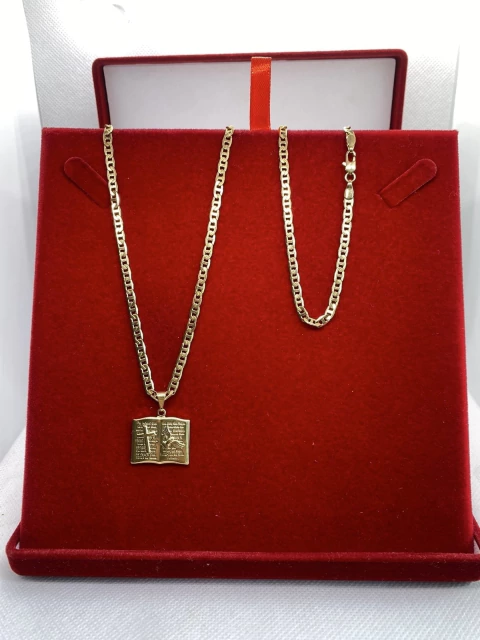 Corrente e Pulseira Piastrine 4mm com Pingente Bíblia com design da Cruz e do Pompo